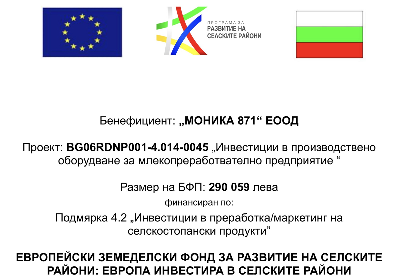 Фирма "Моника 871" ЕООД е бенефициент съгласно АДБФП № BG06RDNP001-4.014-0045 от 25.10.2023 г. с Проект: “Инвестиции в производствено оборудване за млекопреработвателно предприятие“ по подмярка 4.2„Инвестиции в преработка/маркетинг на селскостопански продукти» от ПРСР 2014-2020, ФИНАНСИРАНА ОТ ЕВРОПЕЙСКИ ЗЕМЕДЕЛСКИ ФОНД ЗА РАЗВИТИЕ НА СЕЛСКИТЕ РАЙОНИ: ЕВРОПА ИНВЕСТИРА В СЕЛСКИТЕ РАЙОНИ.